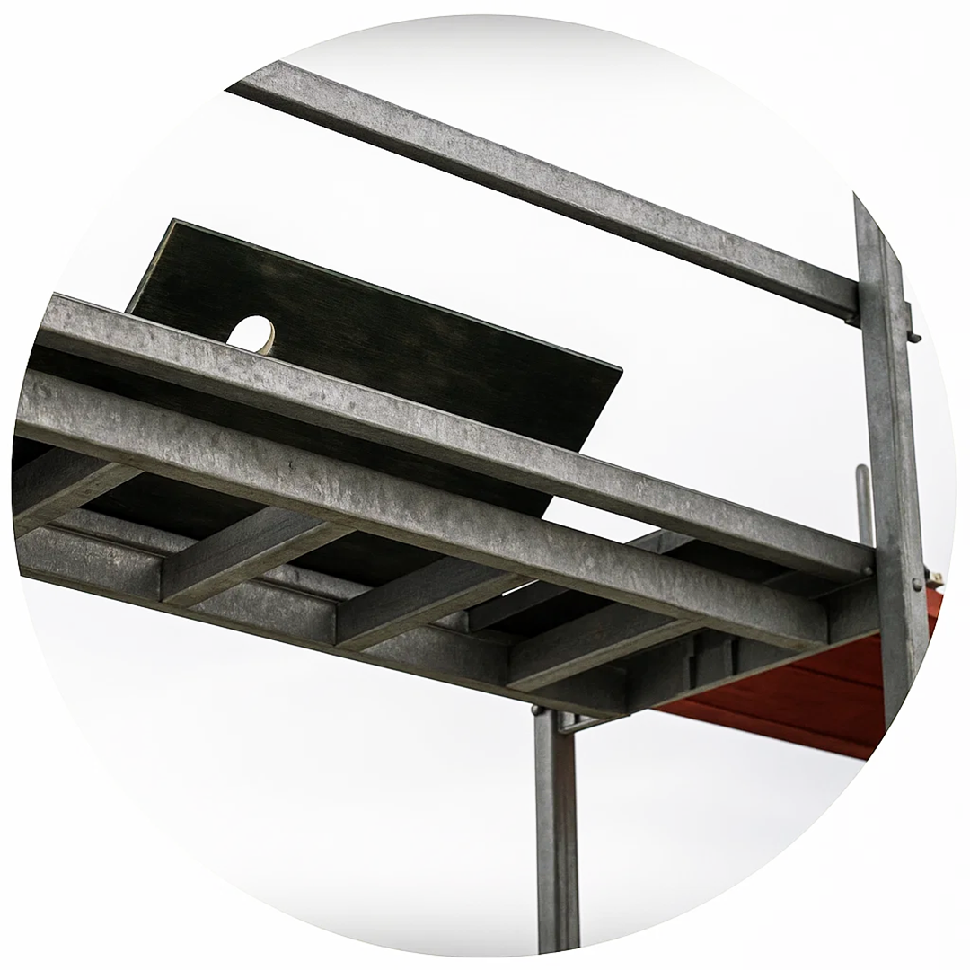 Co więcej, można je montować zarówno z podestami drewnianymi, jak i stalowymi. Cechą charakterystyczną systemu są samozamykające się trzpienie.