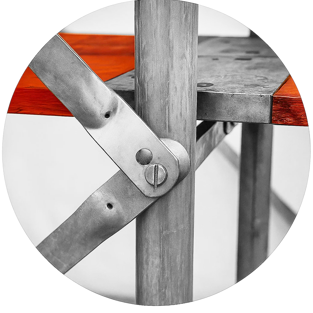 Co więcej, można je montować zarówno z podestami drewnianymi, jak i stalowymi. Cechą charakterystyczną systemu są samozamykające się trzpienie.